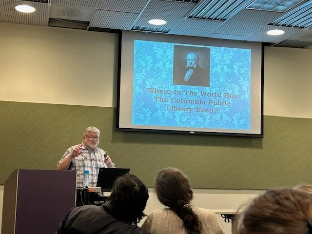 On November 18, 2025, CoMo Preservation and the Daniel Boone Regional Library co-hosted a presentation by Tim Dollens. Dollens explained that the Daniel Boone Regional Library was established in 1959, but the story of Columbia’s library started in the 1800s when the Columbia community decided that there was a need and started a library! In 1846, Dr. A.W. Rollins instructed in his will that he was leaving an encyclopedia to the Columbia library if the library trustees added 500 more books. In 1858 the Columbia Library Association was incorporated by a group including Thomas B. Gentry, James S. Rollins, David H. Hickman, and Robert Levi Todd. They set membership dues at $2.00. Gentry was the son of Richard Gentry and Anne Hawkins Gentry, Columbia’s first woman postmaster. He served as librarian while the library was housed in the courtroom of the Boone County Courthouse.